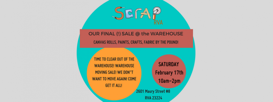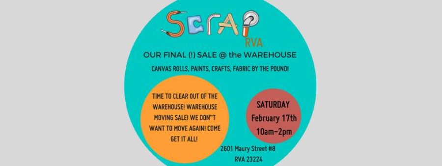 SCRAP RVA will be hosting a Warehouse Sale featuring fabrics, art supplies, and canvas at marked down prices.